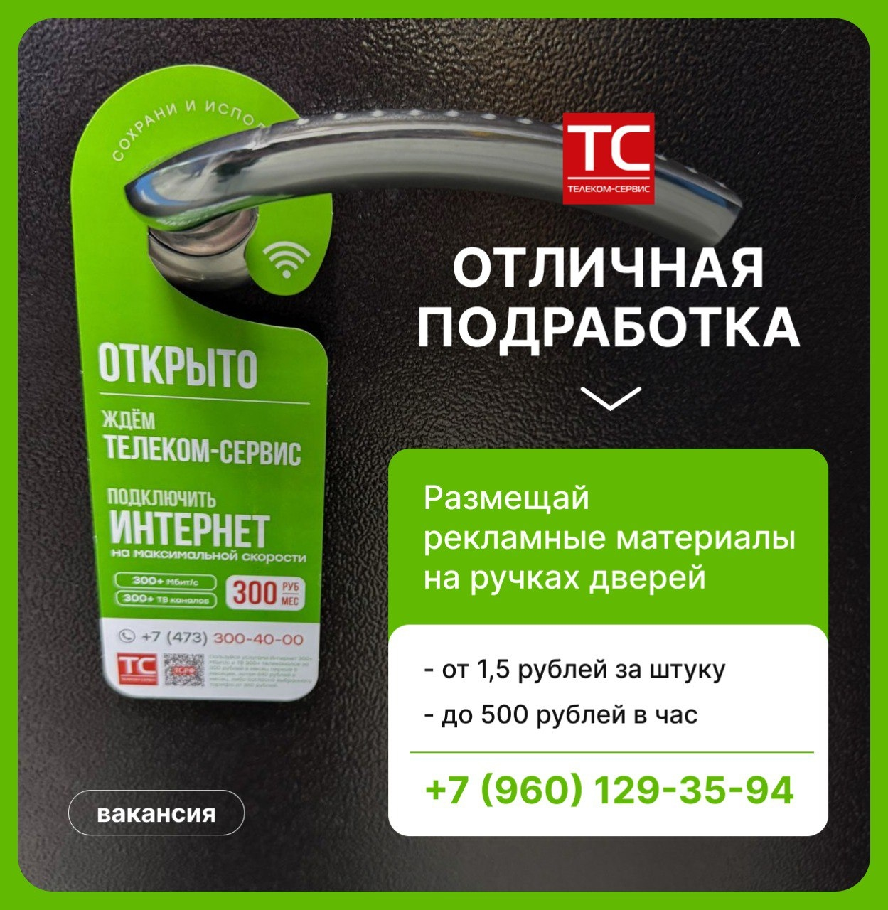 На время проведения рекламной акции компания «Телеком-Сервис» ищет промоутеров для развешивания рекламных листовок (хенгеров) на дверях квартир.